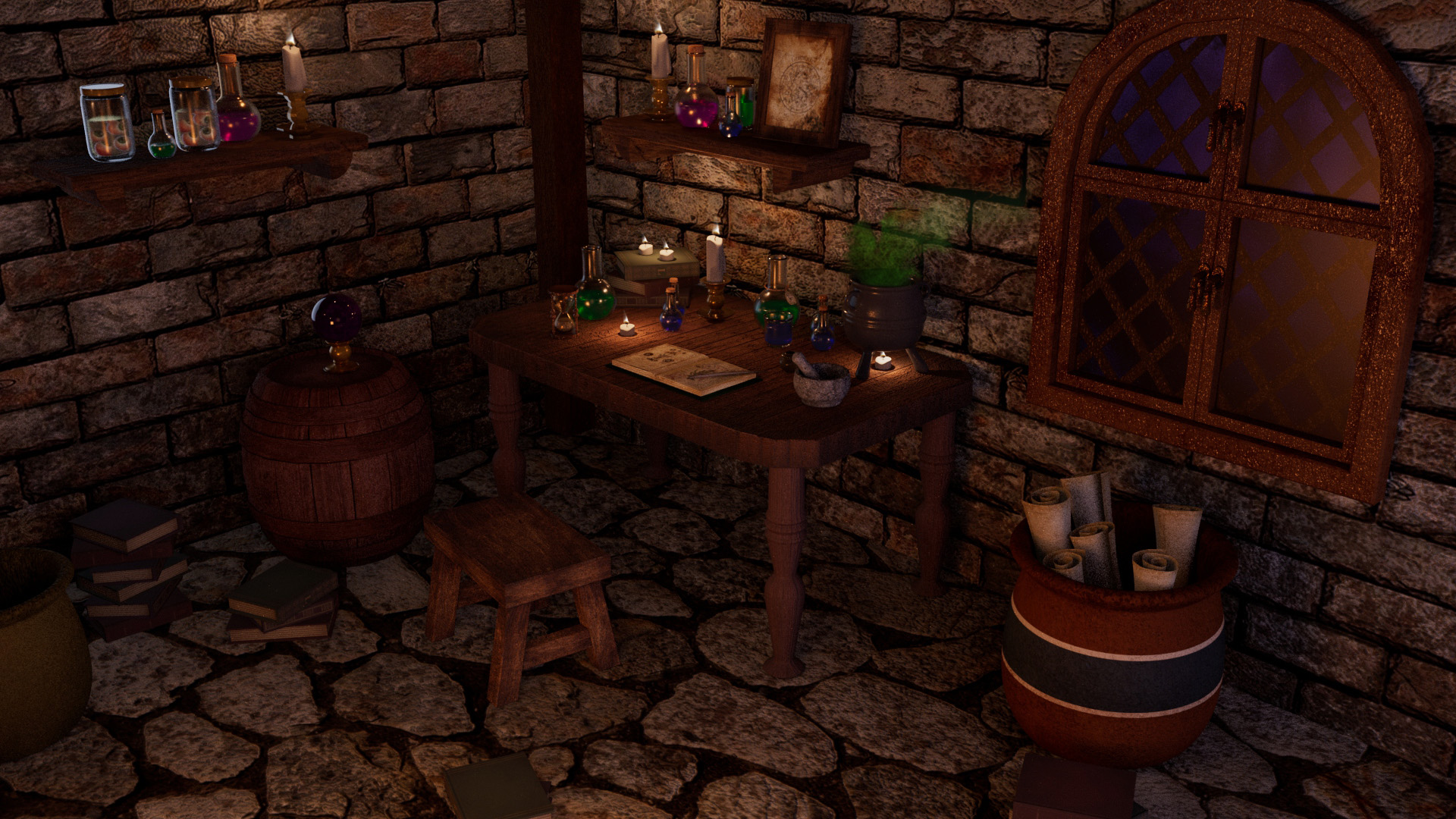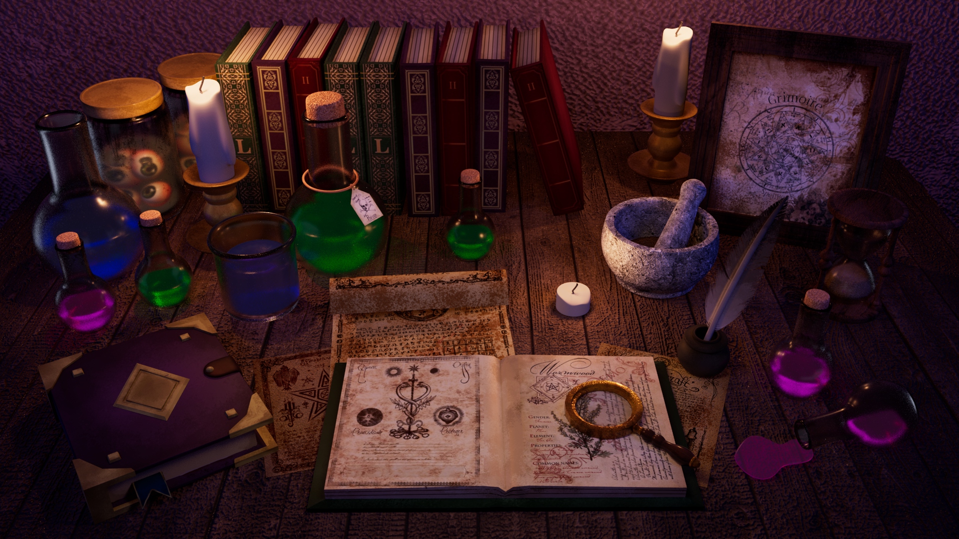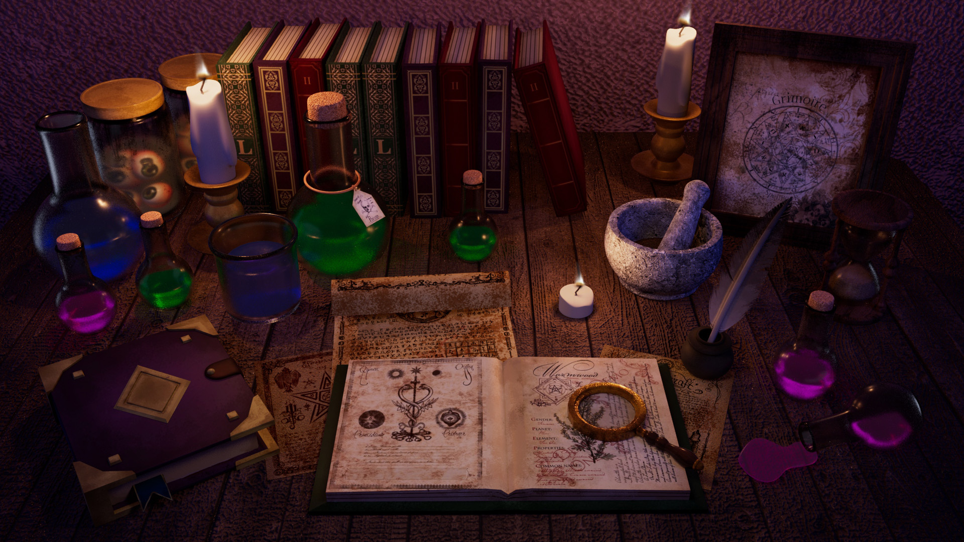 A witch is hiding in her secret lair, studying and researching at night to produce magic potion.